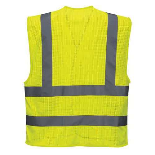 Táto sieťovinová vesta plne spĺňa štandard podľa EN ISO 20471. Perfektná do horúceho počasia. CE certifikované Reflexná páska Zapínanie na suchý zips 5XL Veľkorysý na nosenie Chladiaca pletivová tkanina Vyhovuje RIS 3279-TOM pre železničný priemysel Certifikované po 50 pracích cykloch