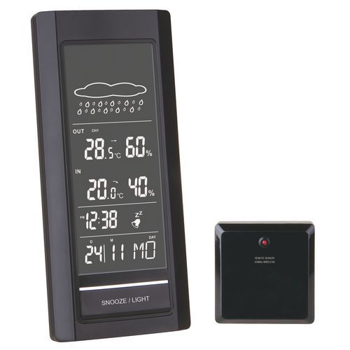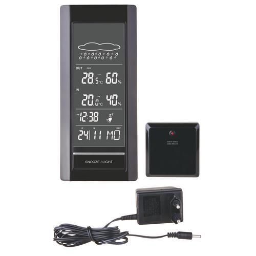 - Multifunkčná meteorologická bezdrôtová stanica s budíkom a s možnosťou pripojenia až troch snímačov.Meteostanica má biele LED podsvietenie displeja, zaznamenáva minimálne a maximálne hodnoty vnútornej a vonkajšej teploty a vlhkosti.