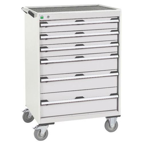 Mobilné zásuvkové skrine Bott Cubio s hornou pracovnou plochou hrúbky 2 cm typu multiplex/linoleum alebo ohranený plech s rohožou. Nosnosť až 600 kg, robustná zváraná oceľová konštrukcia, povrchová úprava práškovým lakom. Centrálne uzamykateľné zásuvky s výškou 3 x 15 a 1 x 20 cm, nosnosťou 50 kg a 100% výsuvom na valčekových ložiskách. Ergonomické rukoväte zásuviek s popisovateľnou lištou, systém blokácie otvorenia viacerých zásuviek naraz. Dve pevné a dve otočné kolesá s brzdou s priemerom 12,5 cm. Max. zaťaženie (kg) : 600 kg