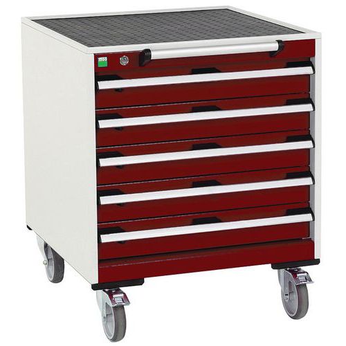 Mobilné zásuvkové skrine Bott Cubio s hornou pracovnou plochou hrúbky 2 cm typu multiplex/linoleum alebo ohranený plech s rohožou. Nosnosť až 300 kg, robustná zváraná oceľová konštrukcia, povrchová úprava práškovým lakom. Centrálne uzamykateľné zásuvky s výškou 5 x 50 kg a 100% výsuvom na valčekových ložiskách. Ergonomické rukoväte zásuviek s popisovateľnou lištou, systém blokácie otvorenia viacerých zásuviek naraz. Dve pevné a dve otočné kolesá s brzdou s priemerom 12,5 cm.