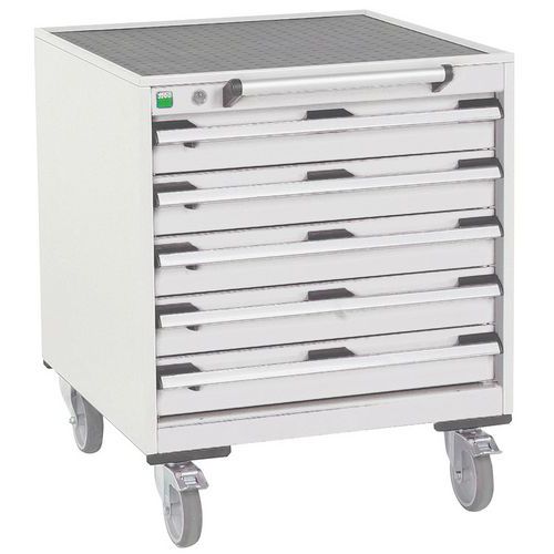 Mobilné zásuvkové skrine Bott Cubio s hornou pracovnou plochou hrúbky 2 cm typu multiplex/linoleum alebo ohranený plech s rohožou. Nosnosť až 300 kg, robustná zváraná oceľová konštrukcia, povrchová úprava práškovým lakom. Centrálne uzamykateľné zásuvky s výškou 5 x 50 kg a 100% výsuvom na valčekových ložiskách. Ergonomické rukoväte zásuviek s popisovateľnou lištou, systém blokácie otvorenia viacerých zásuviek naraz. Dve pevné a dve otočné kolesá s brzdou s priemerom 12,5 cm. Max. zaťaženie (kg) : 300 kg