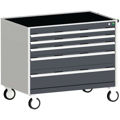 Mobilné zásuvkové skrine Bott Cubio s hornou pracovnou plochou hrúbky 2 cm typu multiplex/linoleum alebo ohranený plech s rohožou. Nosnosť až 600 kg, robustná zváraná oceľová konštrukcia, povrchová úprava práškovým lakom. Centrálne uzamykateľné zásuvky s výškou 2 x , 1 x 10, 1 x 15 a 1 x 20 cm, nosnosťou 50 kg a 100% výsuvom na valčekových ložiskách. Ergonomické rukoväte zásuviek s popisovateľnou lištou, systém blokácie otvorenia viacerých zásuviek naraz. Dve pevné a dve otočné kolesá s brzdou priemere 12,5 cm. Max. zaťaženie (kg) : 600 kg