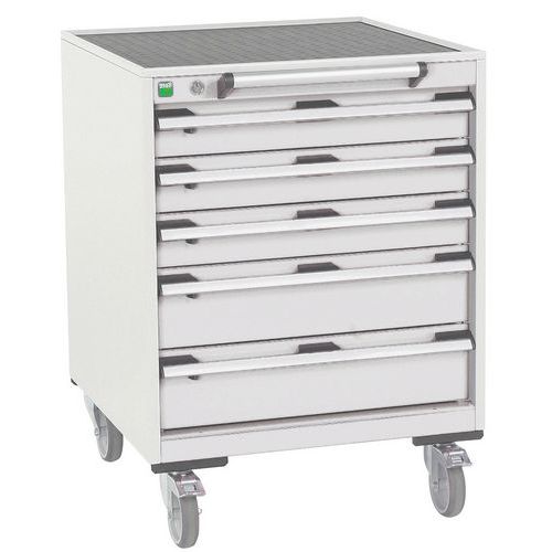 Mobilné zásuvkové skrine Bott Cubio s hornou pracovnou plochou hrúbky 2 cm typu multiplex/linoleum alebo ohranený plech s rohožou. Nosnosť až 300 kg, robustná zváraná oceľová konštrukcia, povrchová úprava práškovým lakom. Centrálne uzamykateľné zásuvky s výškou 3 x 15 cm, nosnosťou 50 kg a 100% výsuvom na valčekových ložiskách. Ergonomické rukoväte zásuviek s popisovateľnou lištou, systém blokácie otvorenia viacerých zásuviek naraz. Dve pevné a dve otočné kolesá s brzdou s priemerom 12,5 cm.