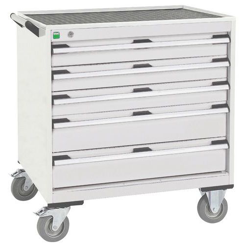 Mobilné zásuvkové skrine Bott Cubio s hornou pracovnou plochou hrúbky 2 cm typu multiplex/linoleum alebo ohranený plech s rohožou. Nosnosť až 600 kg, robustná zváraná oceľová konštrukcia, povrchová úprava práškovým lakom. Centrálne uzamykateľné zásuvky s výškou 3 x 15 cm, nosnosťou 50 kg a 100% výsuvom na valčekových ložiskách. Ergonomické rukoväte zásuviek s popisovateľnou lištou, systém blokácie otvorenia viacerých zásuviek naraz. Dve pevné a dve otočné kolesá s brzdou s priemerom 12,5 cm.