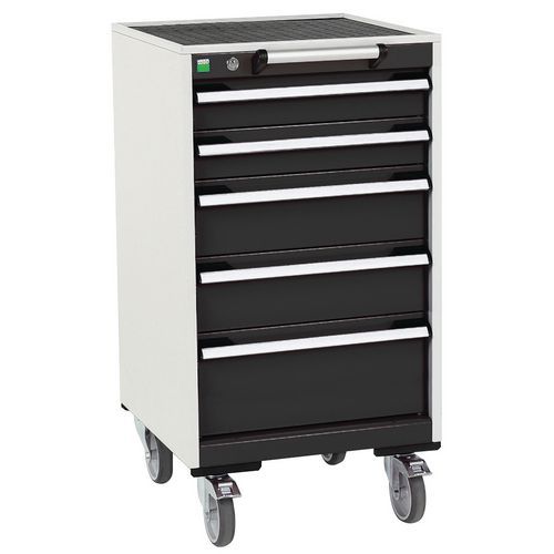 Mobilné zásuvkové skrine Bott Cubio s hornou pracovnou plochou hrúbky 2 cm typu multiplex/linoleum alebo ohranený plech s rohožou. Nosnosť až 300 kg, robustná zváraná oceľová konštrukcia, povrchová úprava práškovým lakom. Centrálne uzamykateľné zásuvky s výškou 2 x 2 15 a 1 x 20 cm, nosnosťou 50 kg a 100% výsuvom na valčekových ložiskách. Ergonomické rukoväte zásuviek s popisovateľnou lištou, systém blokácie otvorenia viacerých zásuviek naraz. Dve pevné a dve otočné kolesá s brzdou s priemerom 12,5 cm. Max. zaťaženie (kg) : 300 kg