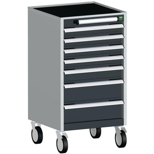 Mobilné zásuvkové skrine Bott Cubio s hornou pracovnou plochou hrúbky 2 cm typu multiplex/linoleum alebo ohranený plech s rohožou. Nosnosť až 300 kg, robustná zváraná oceľová konštrukcia, povrchová úprava práškovým lakom. Centrálne uzamykateľné zásuvky s výškou 4 x 1 x 10 a 2 x 15 cm, nosnosťou 50 kg a 100% výsuvom na valčekových ložiskách. Ergonomické rukoväte zásuviek s popisovateľnou lištou, systém blokácie otvorenia viacerých zásuviek naraz. Dve pevné a dve otočné kolesá s brzdou s priemerom 12,5 cm .