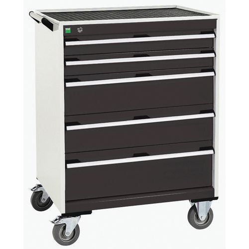 Mobilné zásuvkové skrine Bott Cubio s hornou pracovnou plochou hrúbky 2 cm typu multiplex/linoleum alebo ohranený plech s rohožou. Nosnosť až 600 kg, robustná zváraná oceľová konštrukcia, povrchová úprava práškovým lakom. Centrálne uzamykateľné zásuvky s výškou 2 x 2 15 a 1 x 20 cm, nosnosťou 50 kg a 100% výsuvom na valčekových ložiskách. Ergonomické rukoväte zásuviek s popisovateľnou lištou, systém blokácie otvorenia viacerých zásuviek naraz. Dve pevné a dve otočné kolesá s brzdou s priemerom 12,5 cm. Max. zaťaženie (kg) : 600 kg