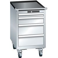 Mobilné dielenské zásuvkové skrine Lista, 4 alebo 5 zásuviek. Rebrovaná protišmyková podložka na vrchu skrine. Pohyb umožňujú 4 kolieska a madlo na manipuláciu. Zámok na kľúč. Optimálne využitie vďaka plnému výsuvu a optimálnej výške čela zásuviek. Vynikajúca ochrana proti prachu, kvapalinám a mechanickému opotrebovaniu vďaka uzavretému rámu s povrchom odolným proti nárazom a oderu. Systém proti prevráteniu, ktorý zabraňuje pádu zásuvky, a individuálne zamykanie zásuviek. Ochrana proti korózii elektroforetickým imerzným lakovaním a striekaním. Optimalizované úložné priestory a organizácie vďaka deliacemu materiálu LISTA prispôsobenému každému použitiu a zásuvkám vybaveným drážkami a perforáciami. Profesionálne popisovanie s popisovacím softvérom LISTA Script a výklopnou úchytkou na vkladanie štítkov. Dokonale tichý pohyb vďaka sane bez priečnika. Deliaci materiál do zásuviek nie je súčasťou dodávky. Nutné dokúpiť zvlášť. Max. zaťaženie (kg) : 75 kg
