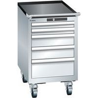 Mobilné dielenské zásuvkové skrine Lista, 4 alebo 5 zásuviek. Rebrovaná protišmyková podložka na vrchu skrine. Pohyb umožňujú 4 kolieska a madlo na manipuláciu. Zámok na kľúč. Optimálne využitie vďaka plnému výsuvu a optimálnej výške čela zásuviek. Vynikajúca ochrana proti prachu, kvapalinám a mechanickému opotrebovaniu vďaka uzavretému rámu s povrchom odolným proti nárazom a oderu. Systém proti prevráteniu, ktorý zabraňuje pádu zásuvky, a individuálne zamykanie zásuviek. Ochrana proti korózii elektroforetickým imerzným lakovaním a striekaním. Optimalizované úložné priestory a organizácie vďaka deliacemu materiálu LISTA prispôsobenému každému použitiu a zásuvkám vybaveným drážkami a perforáciami. Profesionálne popisovanie s popisovacím softvérom LISTA Script a výklopnou úchytkou na vkladanie štítkov. Dokonale tichý pohyb vďaka sane bez priečnika. Deliaci materiál do zásuviek nie je súčasťou dodávky. Nutné dokúpiť zvlášť.