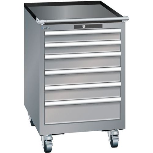 Rebrovaná protišmyková podložka na vrchu skrine. Pohyb umožňujú 4 kolieska a madlo na manipuláciu. Zámok na kľúč. Optimálne využitie vďaka plnému výsuvu a optimálnej výške čela zásuviek. Vynikajúca ochrana proti prachu, kvapalinám a mechanickému opotrebovaniu vďaka uzavretému rámu s povrchom odolným proti nárazom a oderu. Systém proti prevráteniu, ktorý zabraňuje pádu zásuvky, a individuálne zamykanie zásuviek. Ochrana proti korózii elektroforetickým imerzným lakovaním a striekaním. Optimalizované úložné priestory a organizácie vďaka deliacemu materiálu LISTA prispôsobenému každému použitiu a zásuvkám vybaveným drážkami a perforáciami. Profesionálne popisovanie s popisovacím softvérom LISTA Script a výklopnou úchytkou na vkladanie štítkov. Dokonale tichý pohyb vďaka sane bez priečnika. Deliaci materiál do zásuviek nie je súčasťou dodávky. Nutné dokúpiť zvlášť. Max. zaťaženie (kg) : 75 kg