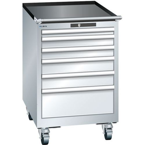 Rebrovaná protišmyková podložka na vrchu skrine. Pohyb umožňujú 4 kolieska a madlo na manipuláciu. Zámok na kľúč. Optimálne využitie vďaka plnému výsuvu a optimálnej výške čela zásuviek. Vynikajúca ochrana proti prachu, kvapalinám a mechanickému opotrebovaniu vďaka uzavretému rámu s povrchom odolným proti nárazom a oderu. Systém proti prevráteniu, ktorý zabraňuje pádu zásuvky, a individuálne zamykanie zásuviek. Ochrana proti korózii elektroforetickým imerzným lakovaním a striekaním. Optimalizované úložné priestory a organizácie vďaka deliacemu materiálu LISTA prispôsobenému každému použitiu a zásuvkám vybaveným drážkami a perforáciami. Profesionálne popisovanie s popisovacím softvérom LISTA Script a výklopnou úchytkou na vkladanie štítkov. Dokonale tichý pohyb vďaka sane bez priečnika. Deliaci materiál do zásuviek nie je súčasťou dodávky. Nutné dokúpiť zvlášť.