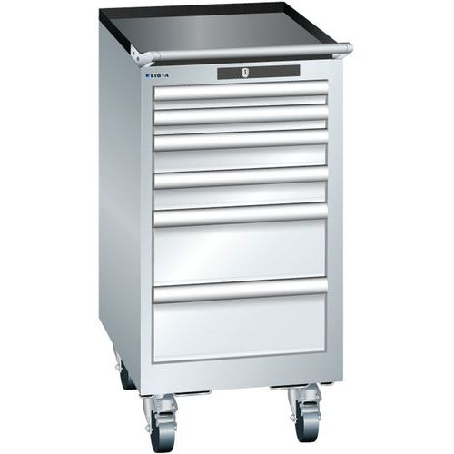 Rebrovaná protišmyková podložka na vrchu skrine. Pohyb umožňujú 4 kolieska a madlo na manipuláciu. Zámok na kľúč. Optimálne využitie vďaka plnému výsuvu a optimálnej výške čela zásuviek. Vynikajúca ochrana proti prachu, kvapalinám a mechanickému opotrebovaniu vďaka uzavretému rámu s povrchom odolným proti nárazom a oderu. Systém proti prevráteniu, ktorý zabraňuje pádu zásuvky, a individuálne zamykanie zásuviek. Ochrana proti korózii elektroforetickým imerzným lakovaním a striekaním. Optimalizované úložné priestory a organizácie vďaka deliacemu materiálu LISTA prispôsobenému každému použitiu a zásuvkám vybaveným drážkami a perforáciami. Profesionálne popisovanie s popisovacím softvérom LISTA Script a výklopnou úchytkou na vkladanie štítkov. Dokonale tichý pohyb vďaka sane bez priečnika. Deliaci materiál do zásuviek nie je súčasťou dodávky. Nutné dokúpiť zvlášť.