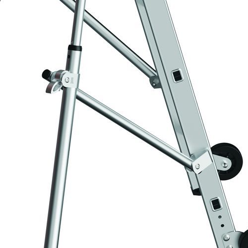 Mobilné platformy Veloce. Pevné 3stranné zábradlie so zadnými popruhmi na ochranu proti pádu Zaťahovacie kolesá pre rýchlu a optimálnu mobilitu. 80 mm protišmykové schodíky. Odnímateľný priehradkový držiak náradia - nosnosť 25 kg, s integrovanými háčikmi (max. 10 kg) Protišmyková podlaha 500 x 400 mm z ekologického dreva. Ergonomický pracovný priestor. Výsuvné stabilizátory s milimetrovým nastavením.