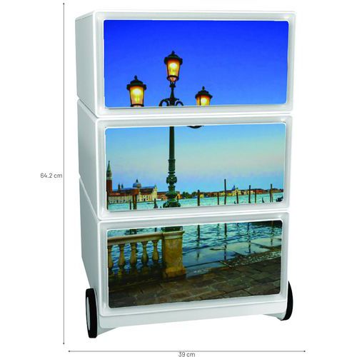 Pojazdné kontajnery s tromi zásuvkami na ukladanie kancelárskych pomôcok. Predná plocha zásuviek z ABS plastu. Pojazdnosť zaisťujú 4 kolieska, z ktorých dve sú otočné. Užitočné rozmery zásuvky sú 32,5 x 13,3 x 40,5 cm. Záruka výrobcu pre zákazníka : 10 rokov