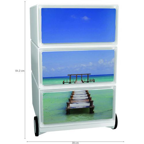 Pojazdné kontajnery s tromi zásuvkami na ukladanie kancelárskych pomôcok. Predná plocha zásuviek z ABS plastu. Pojazdnosť zaisťujú 4 kolieska, z ktorých dve sú otočné. Užitočné rozmery zásuvky sú 32,5 x 13,3 x 40,5 cm.