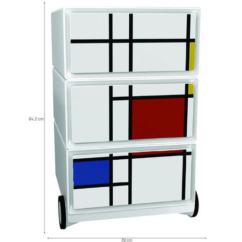 Pojazdné kontajnery s tromi zásuvkami na ukladanie kancelárskych pomôcok. Predná plocha zásuviek z ABS plastu. Pojazdnosť zaisťujú 4 kolieska, z ktorých dve sú otočné. Užitočné rozmery zásuvky sú 32,5 x 13,3 x 40,5 cm.