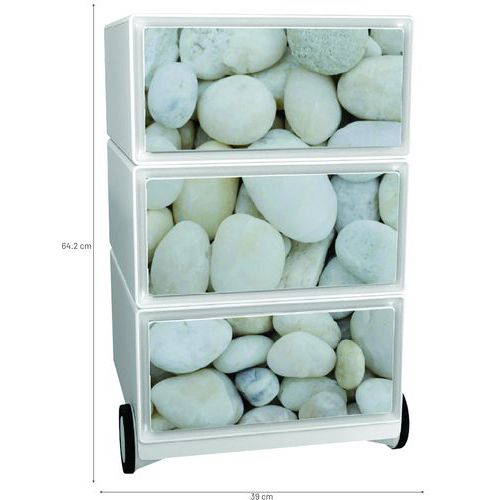 Pojazdné kontajnery s tromi zásuvkami na ukladanie kancelárskych pomôcok. Predná plocha zásuviek z ABS plastu. Pojazdnosť zaisťujú 4 kolieska, z ktorých dve sú otočné. Užitočné rozmery zásuvky sú 32,5 x 13,3 x 40,5 cm.