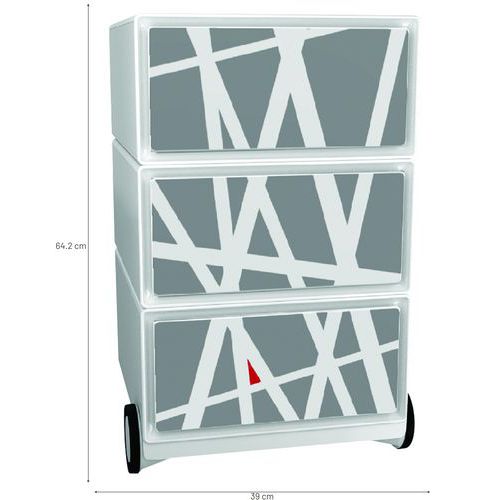 Pojazdné kontajnery s tromi zásuvkami na ukladanie kancelárskych pomôcok. Predná plocha zásuviek z ABS plastu. Pojazdnosť zaisťujú 4 kolieska, z ktorých dve sú otočné. Užitočné rozmery zásuvky sú 32,5 x 13,3 x 40,5 cm.