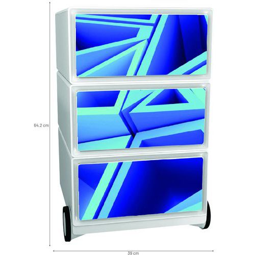 Pojazdné kontajnery s tromi zásuvkami na ukladanie kancelárskych pomôcok. Predná plocha zásuviek z ABS plastu. Pojazdnosť zaisťujú 4 kolieska, z ktorých dve sú otočné. Užitočné rozmery zásuvky sú 32,5 x 13,3 x 40,5 cm.