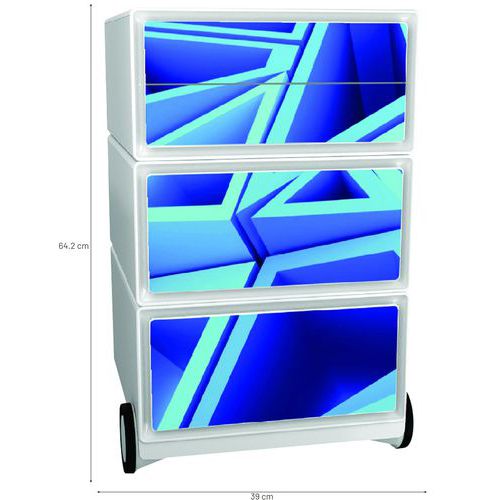 Mobilné dizajnové kontajnery so štyrmi zásuvkami na ukladanie kancelárskych pomôcok. Predná plocha zásuviek z ABS plastu s foto vzorom. Pojazdnosť zaisťujú 4 kolieska, z ktorých dve sú otočné. Užitočné rozmery zásuvky sú 32,5 x 13,3 x 40,5 cm.