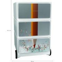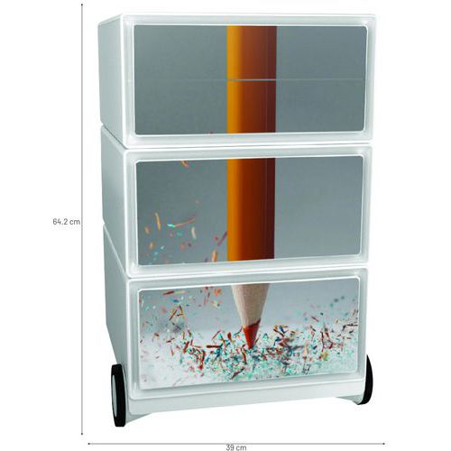 Mobilné dizajnové kontajnery so štyrmi zásuvkami na ukladanie kancelárskych pomôcok. Predná plocha zásuviek z ABS plastu s foto vzorom. Pojazdnosť zaisťujú 4 kolieska, z ktorých dve sú otočné. Užitočné rozmery zásuvky sú 32,5 x 13,3 x 40,5 cm.