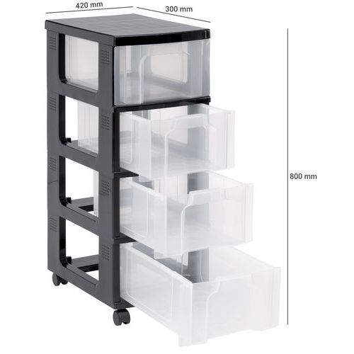 Plastový stojan s vysúvacími boxmi na uloženie dokumentov a rôznych predmetov. Stojan je opatrený štyrmi kolieskami, ktoré zaisťujú jednoduchú mobilitu a manévrovateľnosť. Boxy sú transparentné pre rýchly prehľad o ich obsahu, opatrené úchopom pre rýchle vysunutie. Vzduchotesné uzavretie zaisťuje maximálnu ochranu proti prachu.