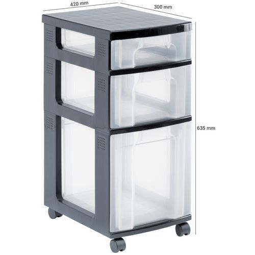 Plastový stojan s vysúvacími boxmi na uloženie dokumentov a rôznych predmetov. Stojan je opatrený štyrmi kolieskami, ktoré zaisťujú jednoduchú mobilitu a manévrovateľnosť. Boxy sú transparentné pre rýchly prehľad o ich obsahu, opatrené úchopom pre rýchle vysunutie. Vzduchotesné uzavretie zaisťuje maximálnu ochranu proti prachu.