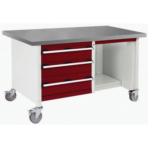 Mobilný dielenský stôl Bott Cubio Storage, 84 x 150 x 75 cm, 3 zásuvky, police, multiplex/linoleum