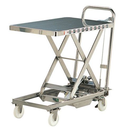 - Mobilný hydraulický zdvíhací stôl v antikorovom vyhotovení s obdĺžnikovou doskou.