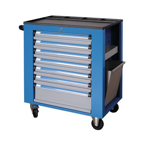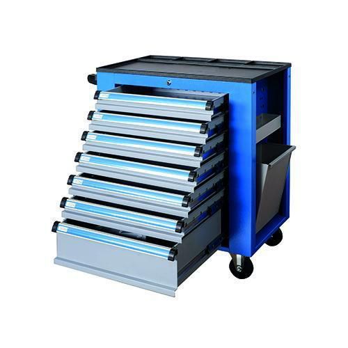 - Uzamykateľný dielenský kovový vozík so siedmimi zásuvkami uloženými na guľôčkových lištách, ktoré umožňujú 100 % výsuv. Vozík má dve otočné a dve pevné kolesá s priemerom 100 mm a odkladaciu hornú plochu s lemom a priehradkami na náradie. Súčasťou vozíka je závesný kôš na čistiace utierky, nastaviteľný držiak na kotúč papiera a závesná kovová miska na drobný materiál. Možnosť dokúpenia deliacej priečky.