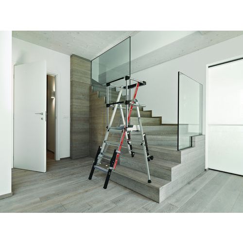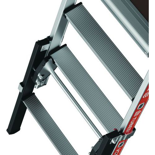 Nastaviteľné hliníkové platformy Raptorscopic. Pevné 3stranné zábradlia so zadnými popruhmi na ochranu proti pádu. Protišmykové schodíky 80 mm (pevná plocha) a 60 mm (teleskopická plocha). Odnímateľný priehradkový držiak náradia s nosnosťou 25 kg, integrované . Teleskopické roviny umožňujúce posun úrovní. Intuitívny a bezpečný systém nastavenia výšky - nastavenie každých 23 cm. Protišmyková podlaha 500 x 400 mm z ekologického dreva. Ergonomický pracovný priestor. Výsuvné stabilizátory s milimetrovým nastavením.