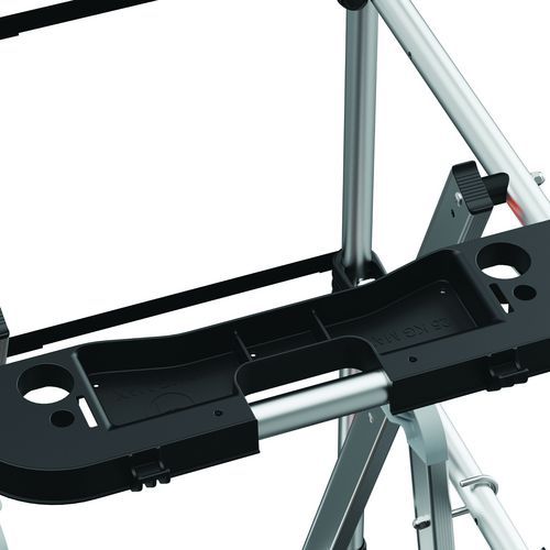 Nastaviteľné hliníkové platformy Raptorscopic. Pevné 3stranné zábradlia so zadnými popruhmi na ochranu proti pádu. Protišmykové schodíky 80 mm (pevná plocha) a 60 mm (teleskopická plocha). Odnímateľný priehradkový držiak náradia s nosnosťou 25 kg, integrované . Teleskopické roviny umožňujúce posun úrovní. Intuitívny a bezpečný systém nastavenia výšky - nastavenie každých 23 cm. Protišmyková podlaha 500 x 400 mm z ekologického dreva. Ergonomický pracovný priestor. Výsuvné stabilizátory s milimetrovým nastavením. Max. zaťaženie (kg) : 150 kg