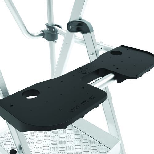 Nastaviteľné plošiny Sherpascopic Saloon. Pevné 4stranné zábradlie s automatickým zatváraním brány typu Saloon. Protišmykové schodíky 80 mm (pevná plocha) a 60 mm (teleskopická plocha). Odnímateľný priehradkový držiak náradia - nosnosť 25 kg, s max. kg). Vysoko komfortná podlaha 590 x 400 mm z protišmykového hliníka. Výsuvné stabilizátory s milimetrovým nastavením. Intuitívny a bezpečný systém nastavenia výšky, nastavenie každých 23 cm. Teleskopické roviny umožňujúce posun úrovní.