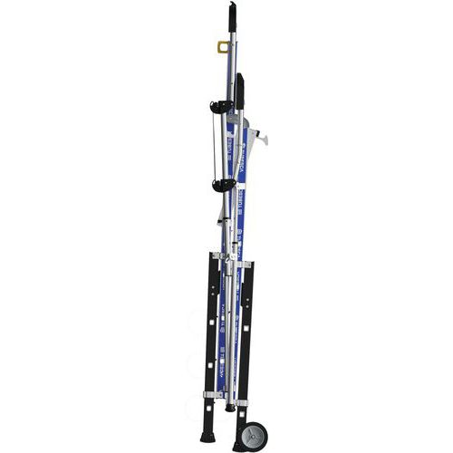 Nastaviteľné platformy Sherpascopic. Pevné 4stranné zábradlie s ochrannými lištami proti pádu s poloautomatickým zatváraním. Protišmykové schodíky 80 mm (pevná plocha) a 60 mm (teleskopická plocha). Odnímateľný priehradkový držiak náradia - nosnosť 25 kg 10 kg). Vysoko komfortná 590 x 400 mm protišmyková platforma z dreva. Výsuvné stabilizátory s milimetrovým nastavením. Teleskopické roviny umožňujúce posun úrovní. Intuitívny a bezpečný systém nastavenia výšky, nastavenia každých 23 cm (po krokoch). Súčasťou sú. dve kolesá s priemerom 175 mm. Platforma sa počíta ako jeden krok. Max. zaťaženie (kg) : 150 kg