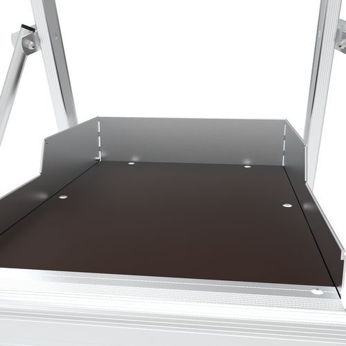 Nastaviteľné platformy Sherpascopic. Pevné 4stranné zábradlie s ochrannými lištami proti pádu s poloautomatickým zatváraním. Protišmykové schodíky 80 mm (pevná plocha) a 60 mm (teleskopická plocha). Odnímateľný priehradkový držiak náradia - nosnosť 25 kg 10 kg). Vysoko komfortná 590 x 400 mm protišmyková platforma z dreva. Výsuvné stabilizátory s milimetrovým nastavením. Teleskopické roviny umožňujúce posun úrovní. Intuitívny a bezpečný systém nastavenia výšky, nastavenia každých 23 cm (po krokoch). Súčasťou sú. dve kolesá s priemerom 175 mm. Platforma sa počíta ako jeden krok.
