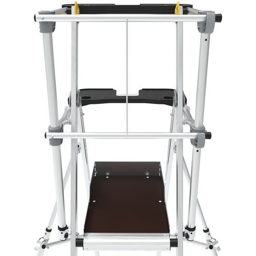 Nastaviteľné platformy Sherpascopic. Pevné 4stranné zábradlie s ochrannými lištami proti pádu s poloautomatickým zatváraním. Protišmykové schodíky 80 mm (pevná plocha) a 60 mm (teleskopická plocha). Odnímateľný priehradkový držiak náradia - nosnosť 25 kg 10 kg). Vysoko komfortná 590 x 400 mm protišmyková platforma z dreva. Výsuvné stabilizátory s milimetrovým nastavením. Teleskopické roviny umožňujúce posun úrovní. Intuitívny a bezpečný systém nastavenia výšky, nastavenia každých 23 cm (po krokoch). Súčasťou sú. dve kolesá s priemerom 175 mm. Platforma sa počíta ako jeden krok. Max. zaťaženie (kg) : 150 kg