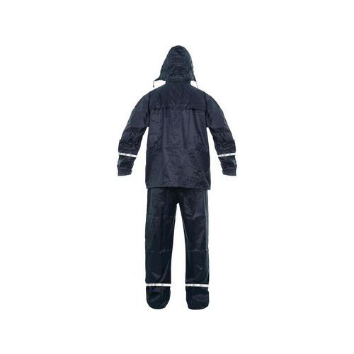 Vodoodolný oblek skladajúci sa z nohavíc v páse do gumy a blúzy s kapucňou v golieri.