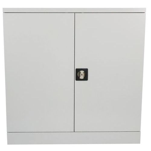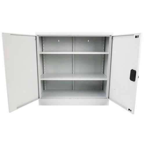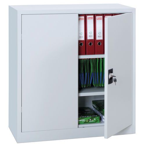 - Nízka kovová skriňa vhodná na ukladanie šanónov a dokumentov.