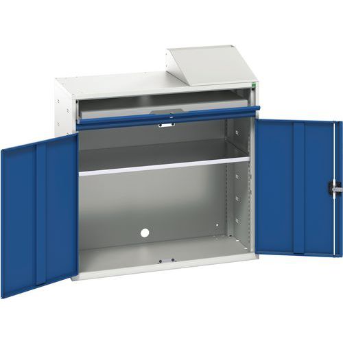 - Pracovná počítačová skriňa vhodná na bezpečné uloženie i použitie počítačovej techniky na pracovisku. 75 kg a priechod pre káble a šikmý písací pult.