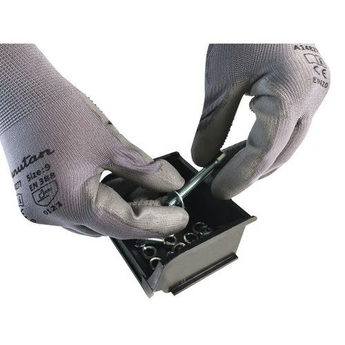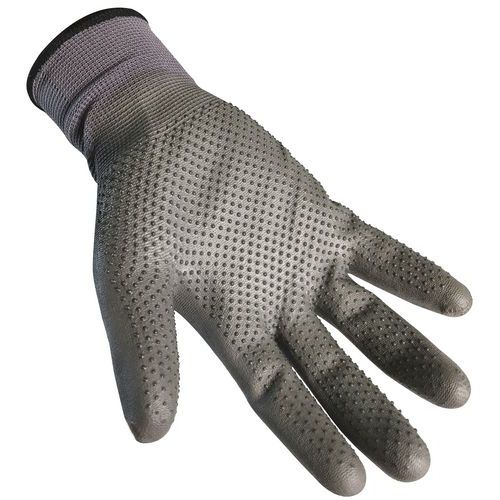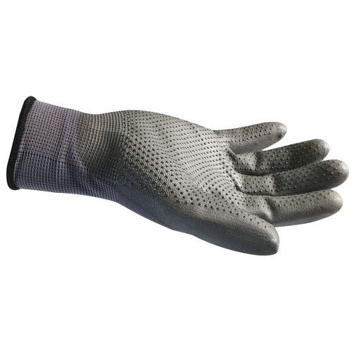 Povrstvené pracovné rukavice s PVC terčíkmi vhodné na každodennú manipuláciu. Vrstva polyuretánu v kombinácii s PVC terčíkmi pokrýva dlaň a prsty. Terčíky znižujú riziko vyšmyknutia uchopeného predmetu. Pružná manžeta zabraňuje skĺznutiu rukavice a zaisťuje pohodlné nosenie.
