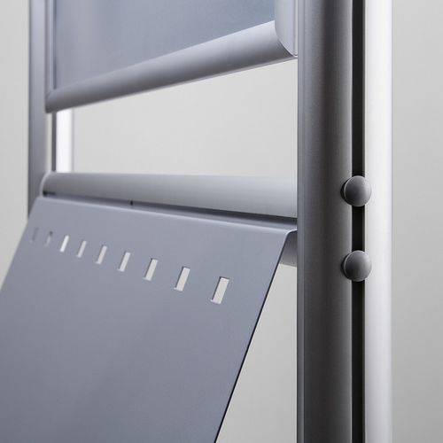 Obojstranné informačné stojany s rámom na plagáty. V spodnej časti sa nachádza priestor na umiestnenie plechového obalu na brožúry, katalógy a iné prospekty. Klip rám s ostrými rohmi a profilom 25 mm. Vyrobené v EÚ