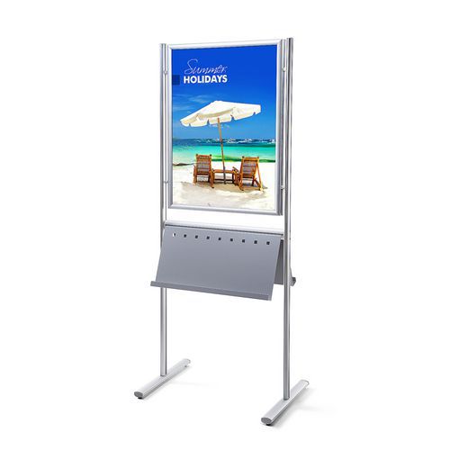 Obojstranné informačné stojany s rámom na plagáty. V spodnej časti sa nachádza priestor na umiestnenie plechového obalu na brožúry, katalógy a iné prospekty. Klip rám s ostrými rohmi a profilom 25 mm. Vyrobené v EÚ