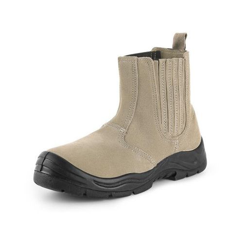 - Plná kožená členková obuv s oceľovou špičkou a krytou pružinou. Materiál: zvršok z kvalitnej hovädzej kože hrúbky 2 - 2,2 mm, krytá gumová pružina na rýchle vyzliekanie, podšívka: hovädzia koža hrúbky 1,2 - 1,4 mm, podrážka: PU-guma, antistatická, ol