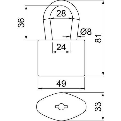Oceľový visací zámok jednoduchej lamelovej konštrukcie, priemer strmeňa 6 mm, výška 36 mm