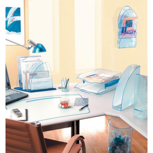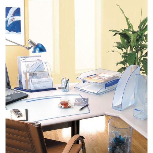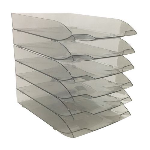 Vysoko stabilné zásobníky na dokumenty formátu A4. Možno ich skladať vertikálne alebo stupňovito. 2 integrované držiaky štítkov na prednej strane. Pojmú dokumenty formátu A4, 24 x 32 cm a elastické zložky. Protišmykové podložky.