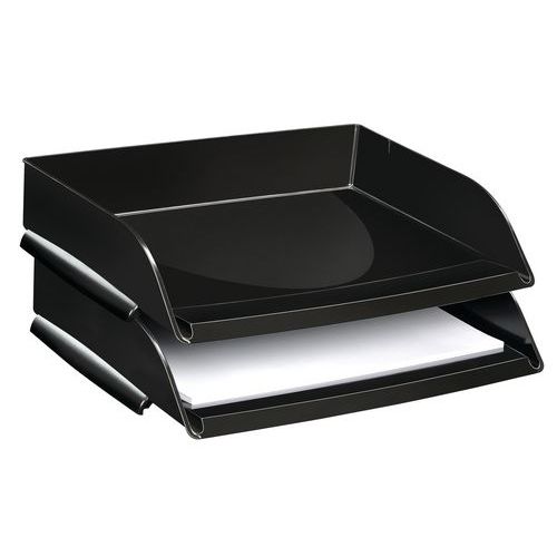 Zásobníky na dokumenty so širokými bočnými výstuhami. Odkladače so skosenými hranami. Praktický formát na šírku uľahčuje ukladanie, vyhľadávanie a vyťahovanie dokumentov. Možno ich stohovať vertikálne alebo stupňovito.