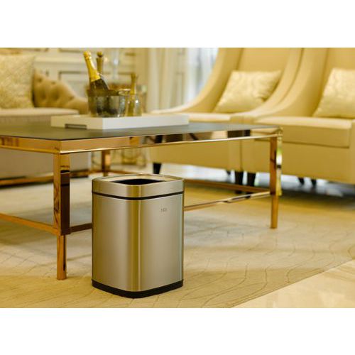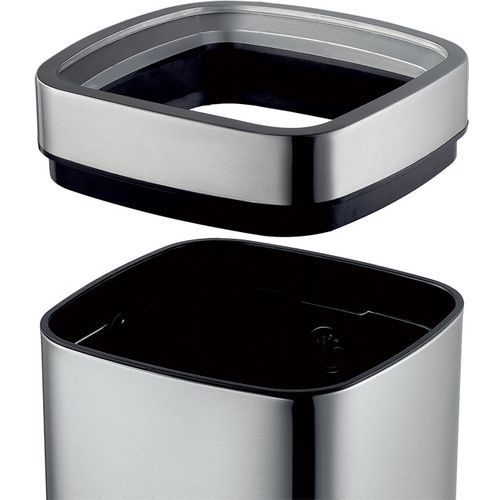 - Štvorcový odpadkový kôš z matnej nehrdzavejúcej ocele s horným otvorom.