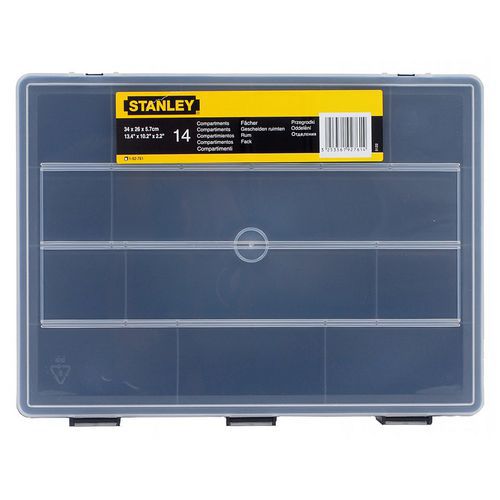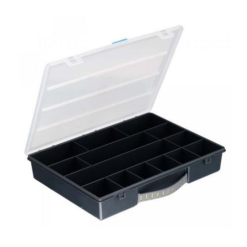 - Plastový zásobník obsahuje štrnásť neprestaviteľných priehradiek na drobný materiál. Priehľadné veko uzatvárateľné pomocou plastových klíps. Ľahká manipulácia pomocou držadla.