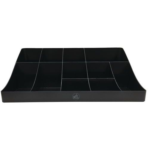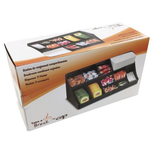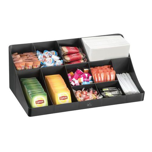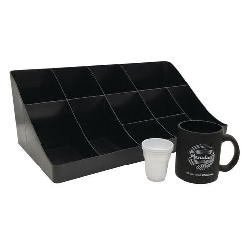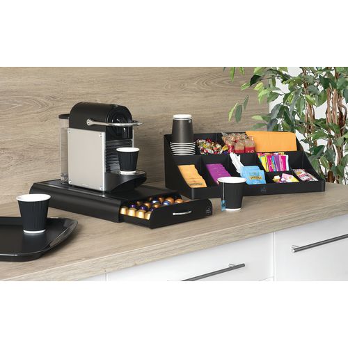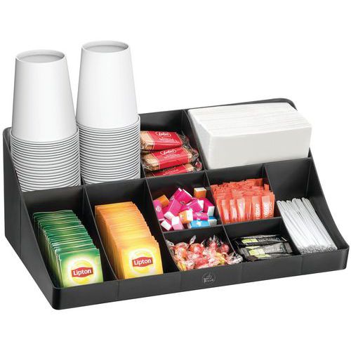 Táto úložná stanica dokonale zapadne do vášho kuchynského priestoru. 11 priehradok na uloženie všetkého potrebného príslušenstva vedľa kávovaru a kanvice (obrúsky, šálky, lyžičky, cukor, čajové vrecká atď.). Pojme viac ako 300 šálok. Vyrobené z nárazuvzdorného plastu. Bez nutnej montáže.