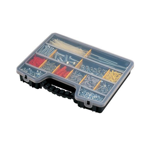 - Plastové organizéry na uloženie drobného materiálu či náradia. Skladajú sa z piatich pevných polí, ktoré je možné vďaka nastaviteľným priečkam rozdeliť na menšie priehradky. Priehľadné veko je možné uzavrieť pomocou plastových klíps. Ľahká manipulácia vďaka pevnému držadlu.